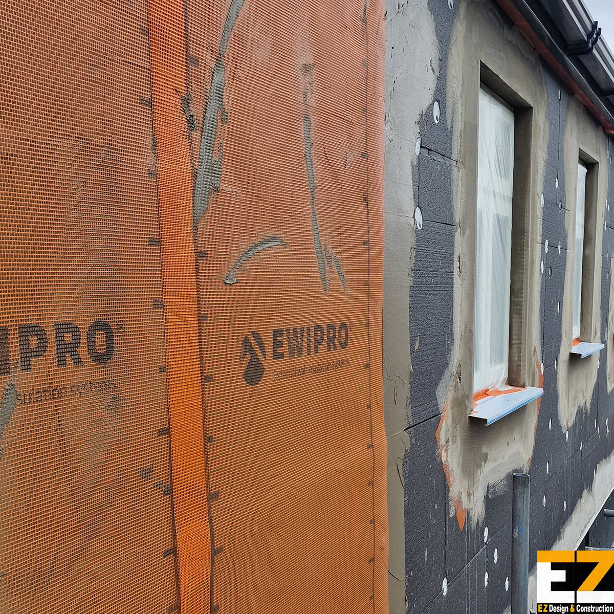 The project was finished with a 1.5mm grain silicone render topcoat, selected for its water-repellent performance and long-term durability.